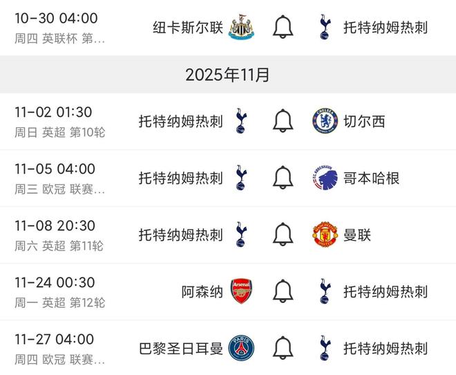 热刺接下来六场赛程:
